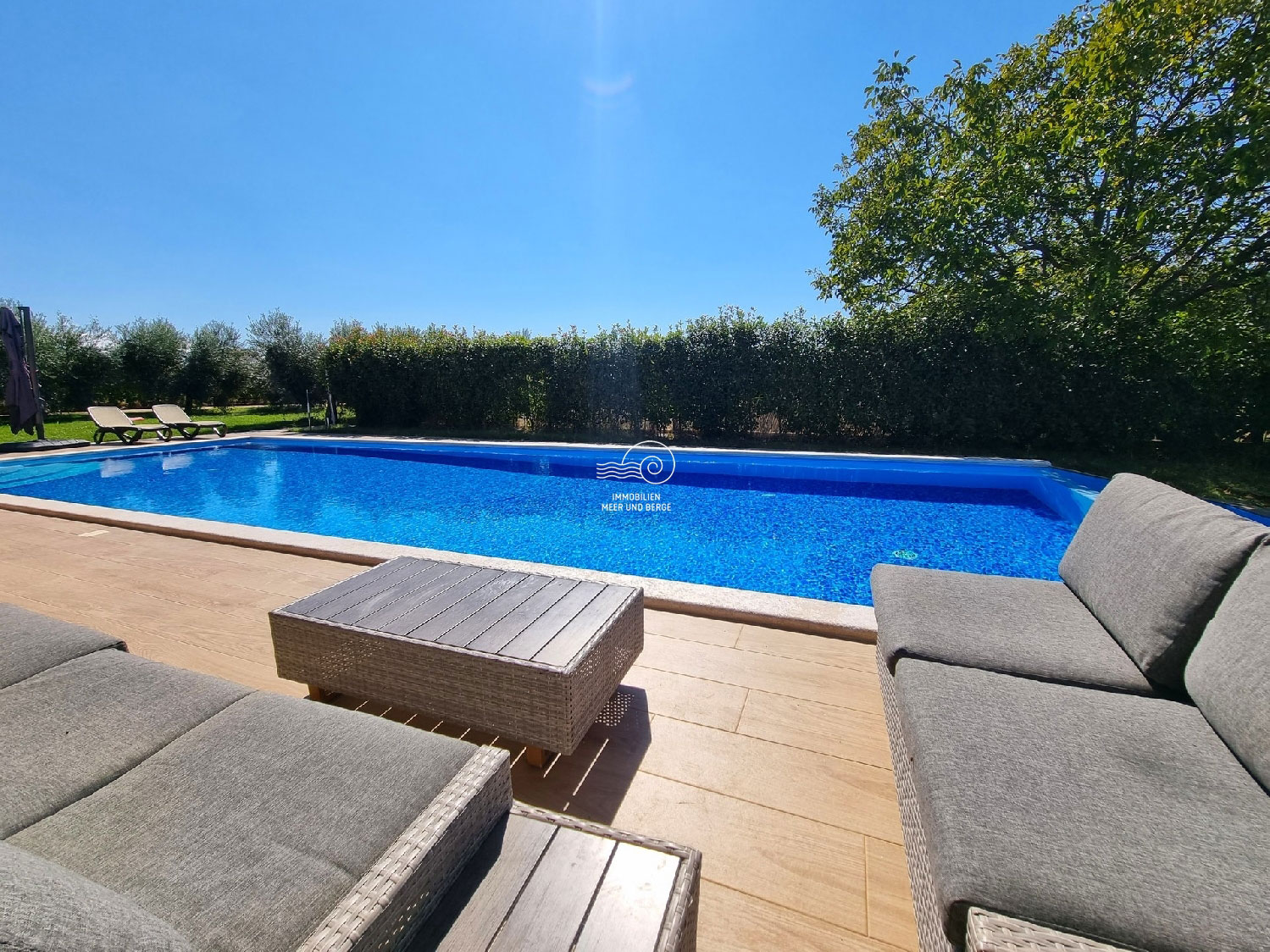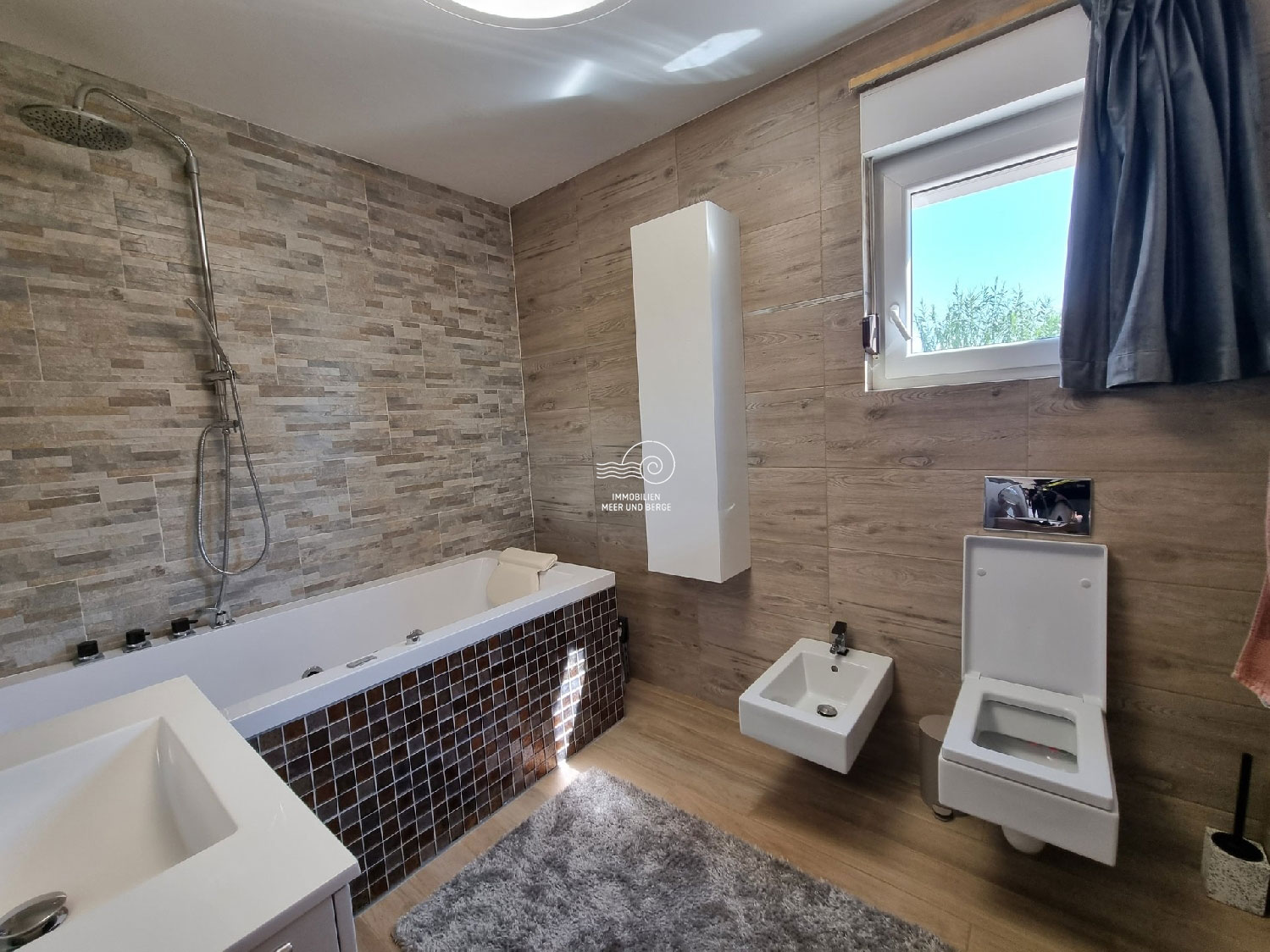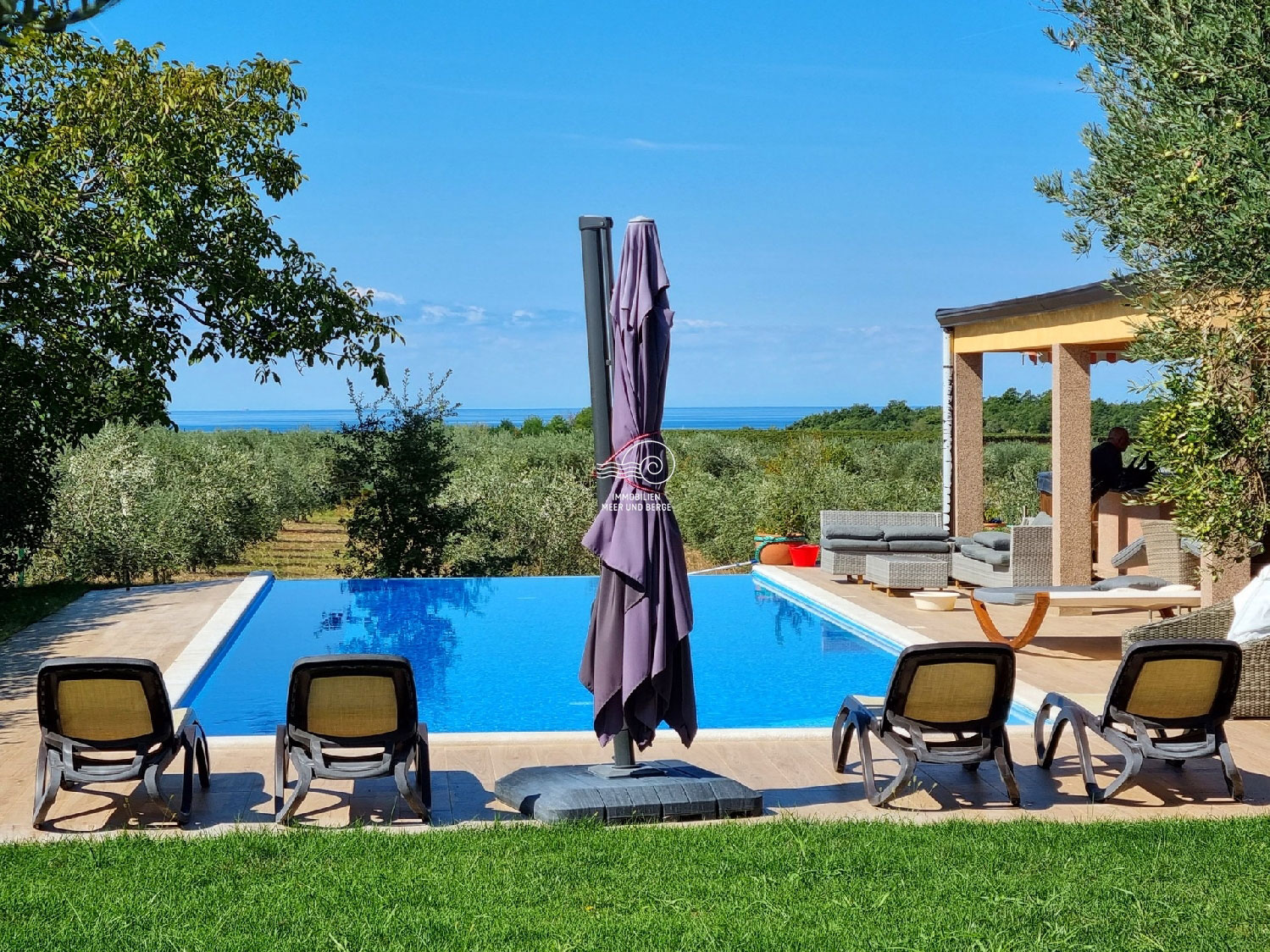 Zum Verkauf steht eine luxuriöse Villa in Novigrad mit Meerblick, einem Pool mit Meerwasser, einem Whirlpool und Blick auf die Olivenhaine. Sie befindet sich in einer sehr ruhigen Umgebung, wo Ihnen Ruhe und Privatsphäre garantiert sind! Geeignet für Tourismus oder privat. Definitive Rendite der Investition! Der Eingang besteht aus einer Küche mit Essbereich und einem großen Empfangsbereich mit einem bezaubernden Blick. Die Küche ist vom italienischen Hersteller und komplett ausgestattet. Es gibt auch einen Abstellraum, ein Badezimmer mit Duschkabine und ein Schlafzimmer mit Zugang zum Garten. Das zweite Schlafzimmer bietet eine wunderschön eingerichtete Umgebung mit Blick auf den Pool, ein Badezimmer und eine Jacuzzi-Badewanne. Durch das Haus und den Hof erstreckt sich spezielle Beleuchtung. Der 50 m2 große Keller ist eine Wellnessoase mit Saunen und einem Ruhebereich. Die Terrasse ist überdacht und hat etwa 45 m2 mit einem herrlichen Blick auf den 102 m2 großen Pool (17m x 6m). Im Hof befinden sich 42 alte Olivenbäume, die wunderschön beleuchtet sind. Die Rasenflächen verfügen über ein Bewässerungssystem. Es gibt einen privaten Eingang zum Grundstück mit Alarm und automatischer Öffnung