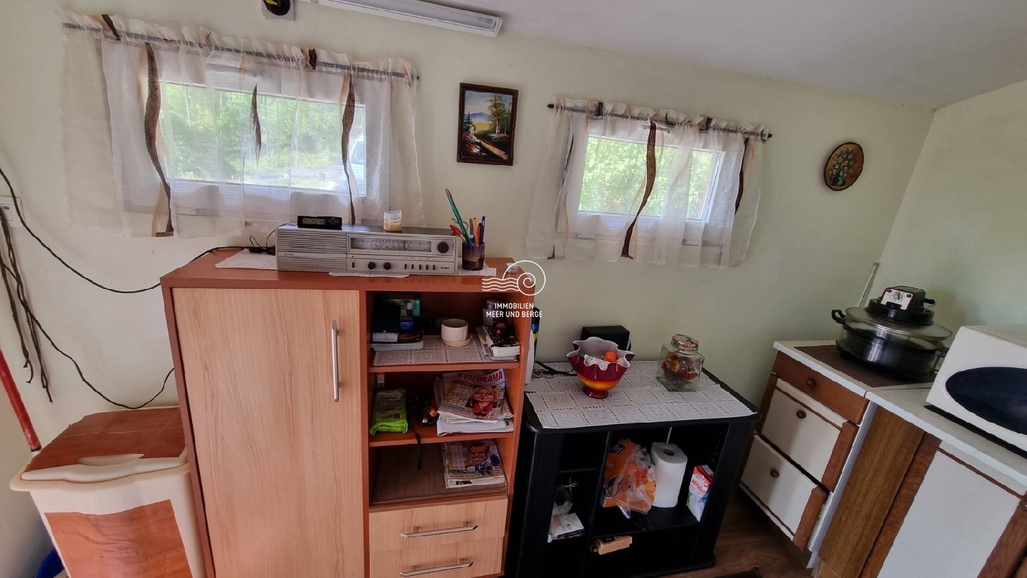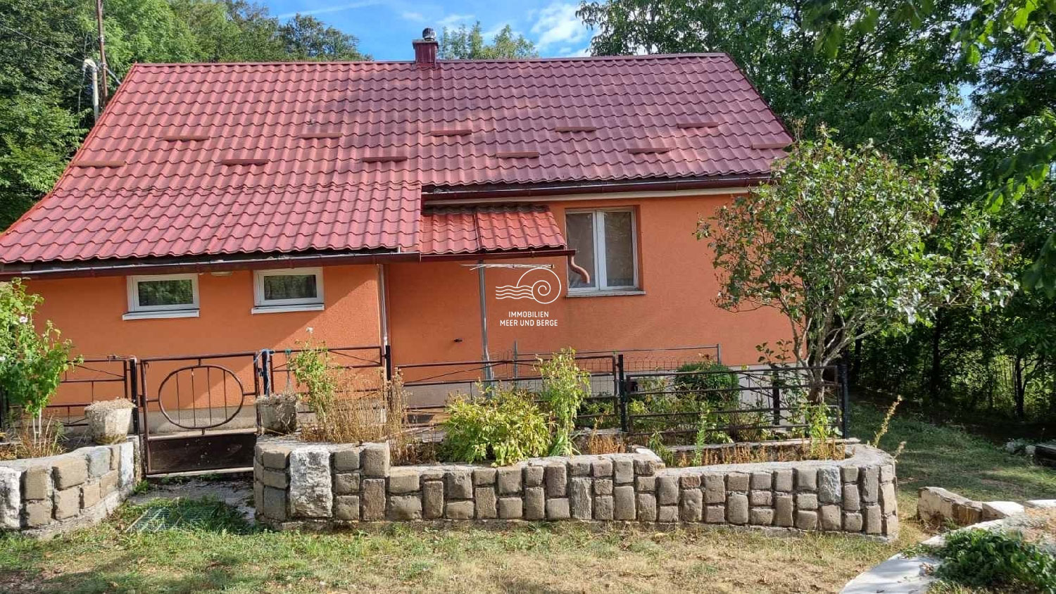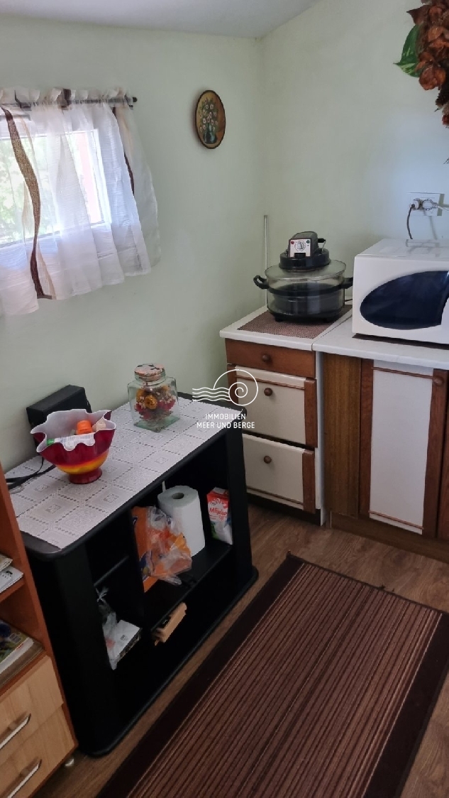 KRIVI PUT-Einfamilienhaus, Erdgeschoss + Hochparterre, + 400 m2, Garten. Im Erdgeschoss des Hauses gibt es ein Wohnzimmer, eine Küche mit Esszimmer, das zu einer schönen Terrasse führt. Im hohen Dachgeschoss befinden sich zwei Schlafzimmer. Im Keller des Hauses gibt es eine große Taverne und eine Garage. Das Haus ist ideal zum Ausruhen und Genießen der Natur, nur 20 Minuten vom Meer entfernt.