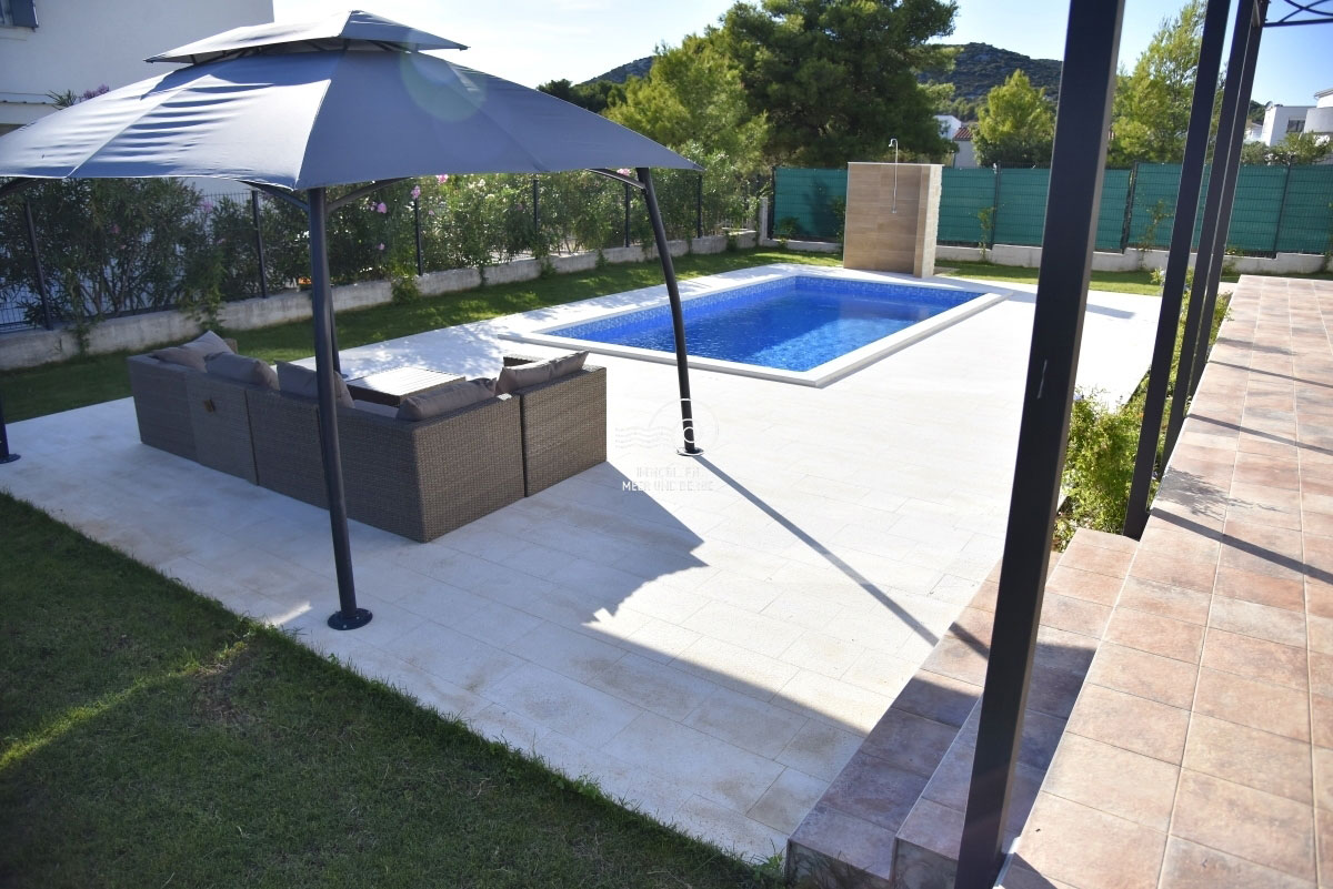 In Tribunj, Stadtteil Sovlja, steht ein neu gebautes Einfamilienhaus mit Swimmingpool zum Verkauf. Das Haus liegt auf einem Grundstück von 576 m2.