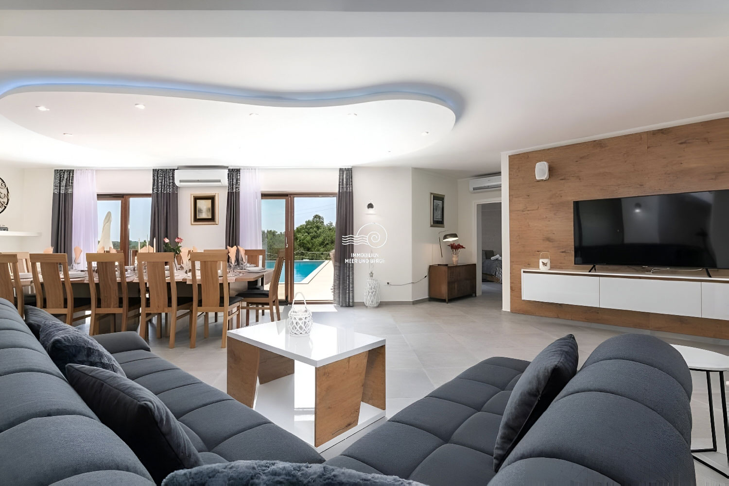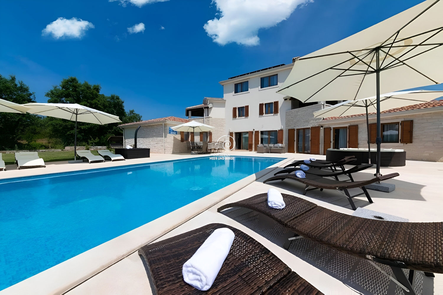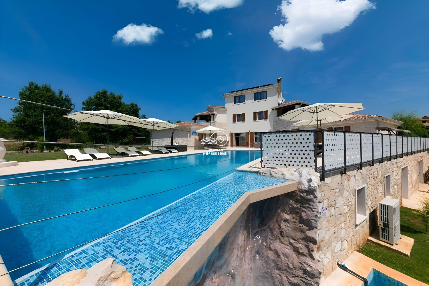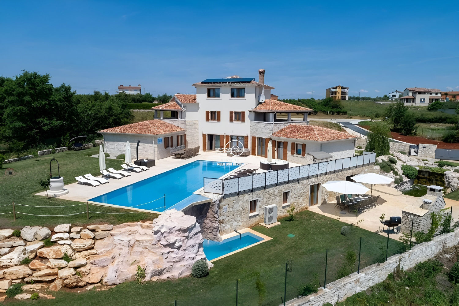 Der Wohnbereich von San Lorenzo erstreckt sich über 380 m2, der Raum ist voll klimatisiert und mit hochwertigen Möbeln und Geräten ausgestattet. Das Haus ist mit Fußbodenheizung und -kühlung ausgestattet und in jedem Raum besteht die Möglichkeit, den Betrieb der Lautsprecher separat einzustellen. Im Erdgeschoss des Hauses gibt es ein Wohnzimmer mit einem Sofa mit der Möglichkeit eines Bettes für 2 Personen, einen Fernseher, ein Esszimmer für 12 Personen, einen Kamin, eine voll ausgestattete Küche, eine Eismaschine, einen weiteren Tisch für 8 Personen, eine Couch und ein weiterer Fernseher. Vom Esszimmer aus gelangt man in ein Schlafzimmer mit Doppelbett, eigenem Bad und Zugang zum Pool. Vom Wohnzimmer aus gelangt man in alle Schlafzimmer mit Doppelbetten und eigenem Bad, eines davon mit Zugang zum Pool. Im Flur im Erdgeschoss befindet sich ein zusätzliches Badezimmer mit Dusche/WC. Im ersten Stock des Hauses befinden sich 2 Schlafzimmer mit Doppelbett, private Badezimmer, jeweils mit eigenem Balkon mit Sofa. Im zweiten Stock des Hauses gibt es ein Zimmer mit einem Doppelbett, einem Sofa mit der Möglichkeit eines Schlafplatzes für zwei Personen und einem eigenen Badezimmer.