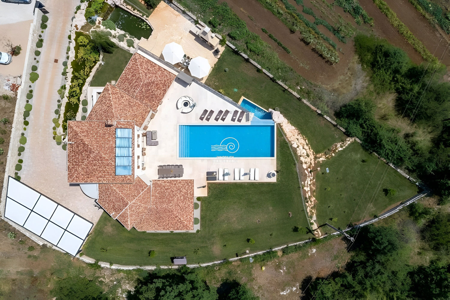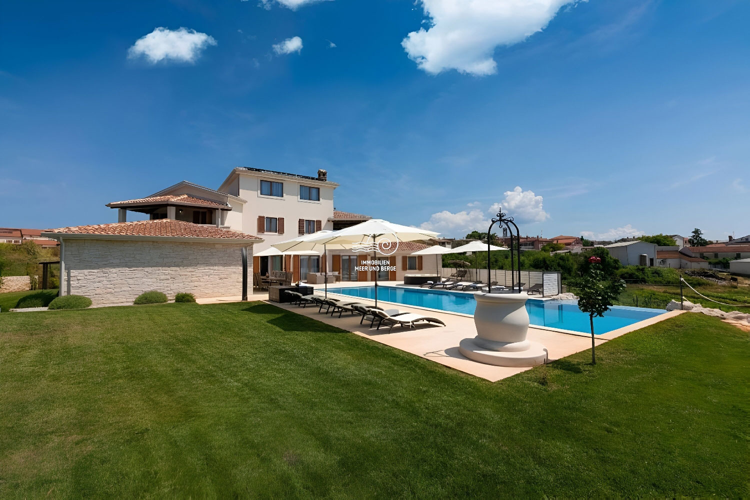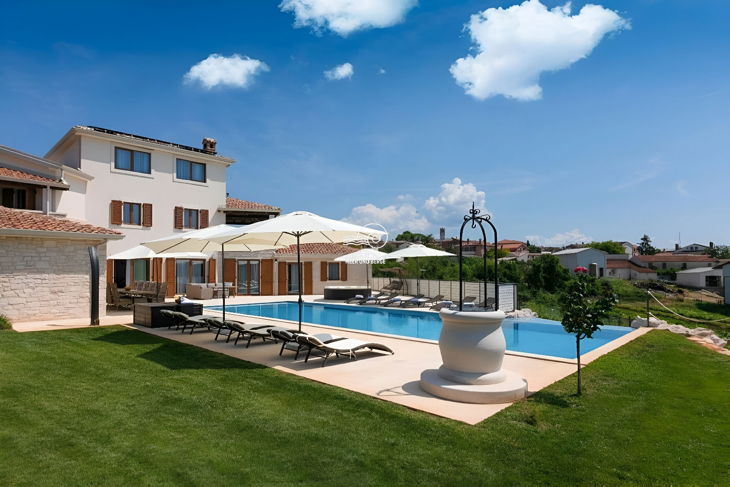 Der Wohnbereich von San Lorenzo erstreckt sich über 380 m2, der Raum ist voll klimatisiert und mit hochwertigen Möbeln und Geräten ausgestattet. Das Haus ist mit Fußbodenheizung und -kühlung ausgestattet und in jedem Raum besteht die Möglichkeit, den Betrieb der Lautsprecher separat einzustellen. Im Erdgeschoss des Hauses gibt es ein Wohnzimmer mit einem Sofa mit der Möglichkeit eines Bettes für 2 Personen, einen Fernseher, ein Esszimmer für 12 Personen, einen Kamin, eine voll ausgestattete Küche, eine Eismaschine, einen weiteren Tisch für 8 Personen, eine Couch und ein weiterer Fernseher. Vom Esszimmer aus gelangt man in ein Schlafzimmer mit Doppelbett, eigenem Bad und Zugang zum Pool. Vom Wohnzimmer aus gelangt man in alle Schlafzimmer mit Doppelbetten und eigenem Bad, eines davon mit Zugang zum Pool. Im Flur im Erdgeschoss befindet sich ein zusätzliches Badezimmer mit Dusche/WC. Im ersten Stock des Hauses befinden sich 2 Schlafzimmer mit Doppelbett, private Badezimmer, jeweils mit eigenem Balkon mit Sofa. Im zweiten Stock des Hauses gibt es ein Zimmer mit einem Doppelbett, einem Sofa mit der Möglichkeit eines Schlafplatzes für zwei Personen und einem eigenen Badezimmer.
