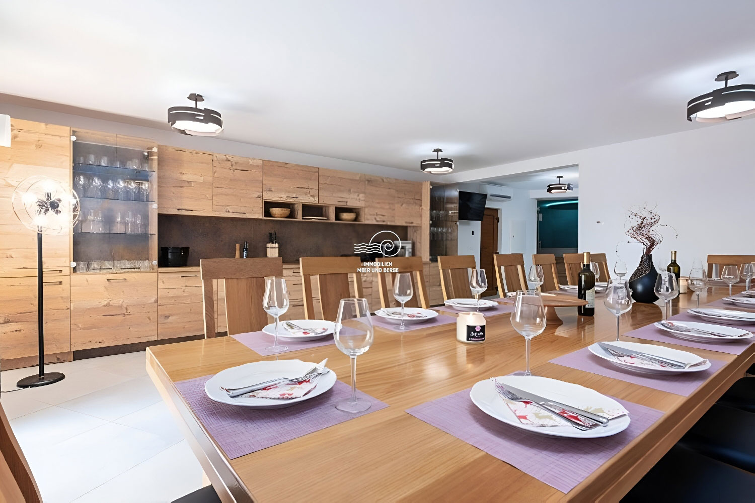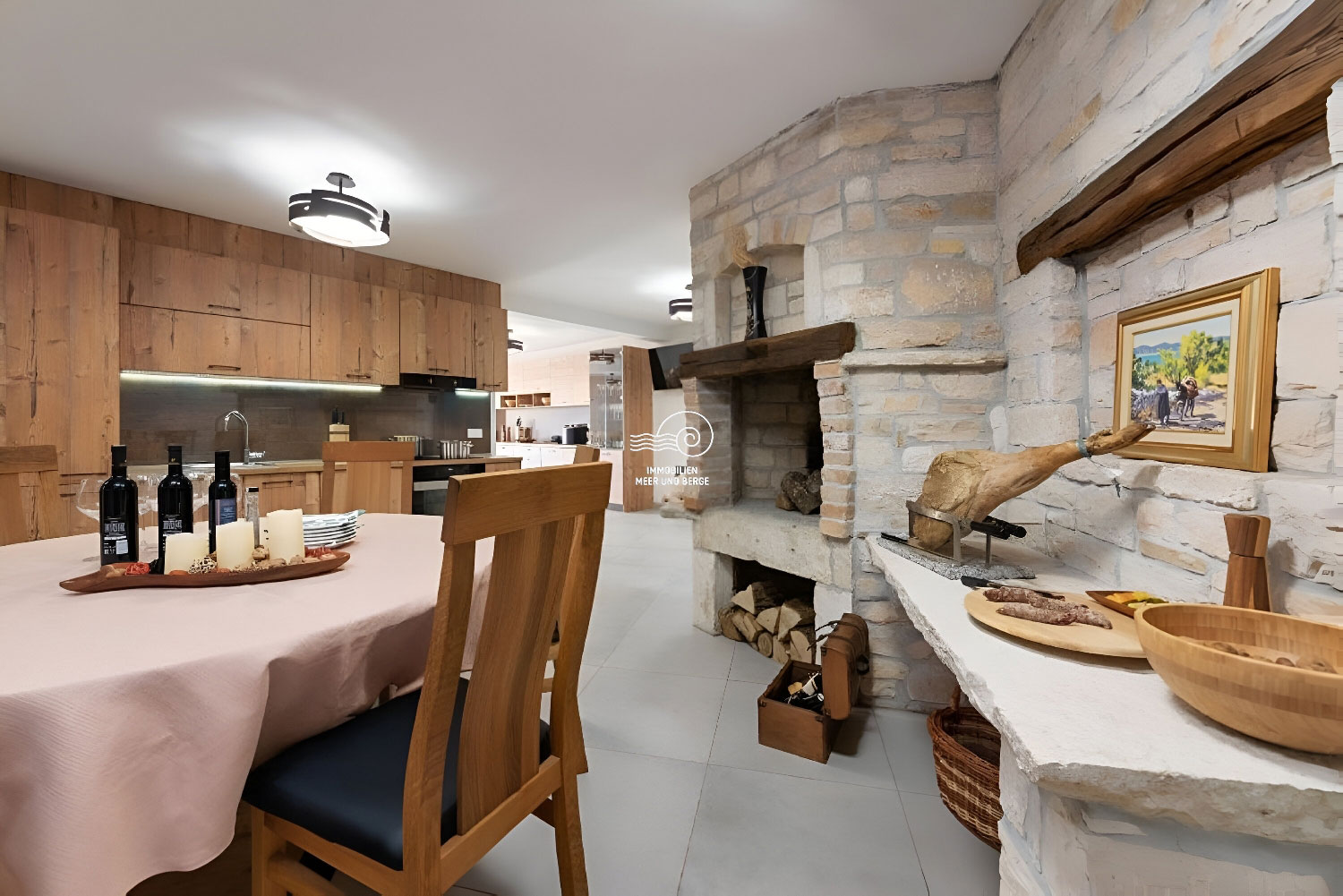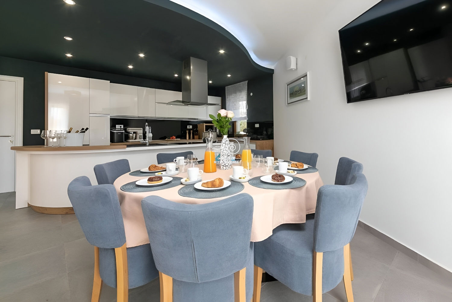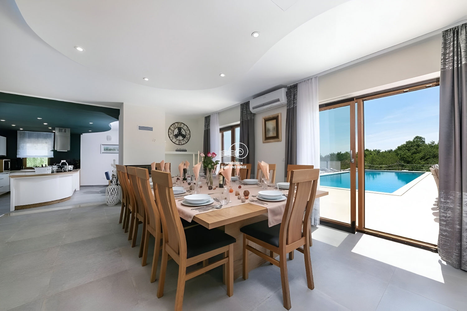 Der Wohnbereich von San Lorenzo erstreckt sich über 380 m2, der Raum ist voll klimatisiert und mit hochwertigen Möbeln und Geräten ausgestattet. Das Haus ist mit Fußbodenheizung und -kühlung ausgestattet und in jedem Raum besteht die Möglichkeit, den Betrieb der Lautsprecher separat einzustellen. Im Erdgeschoss des Hauses gibt es ein Wohnzimmer mit einem Sofa mit der Möglichkeit eines Bettes für 2 Personen, einen Fernseher, ein Esszimmer für 12 Personen, einen Kamin, eine voll ausgestattete Küche, eine Eismaschine, einen weiteren Tisch für 8 Personen, eine Couch und ein weiterer Fernseher. Vom Esszimmer aus gelangt man in ein Schlafzimmer mit Doppelbett, eigenem Bad und Zugang zum Pool. Vom Wohnzimmer aus gelangt man in alle Schlafzimmer mit Doppelbetten und eigenem Bad, eines davon mit Zugang zum Pool. Im Flur im Erdgeschoss befindet sich ein zusätzliches Badezimmer mit Dusche/WC. Im ersten Stock des Hauses befinden sich 2 Schlafzimmer mit Doppelbett, private Badezimmer, jeweils mit eigenem Balkon mit Sofa. Im zweiten Stock des Hauses gibt es ein Zimmer mit einem Doppelbett, einem Sofa mit der Möglichkeit eines Schlafplatzes für zwei Personen und einem eigenen Badezimmer.