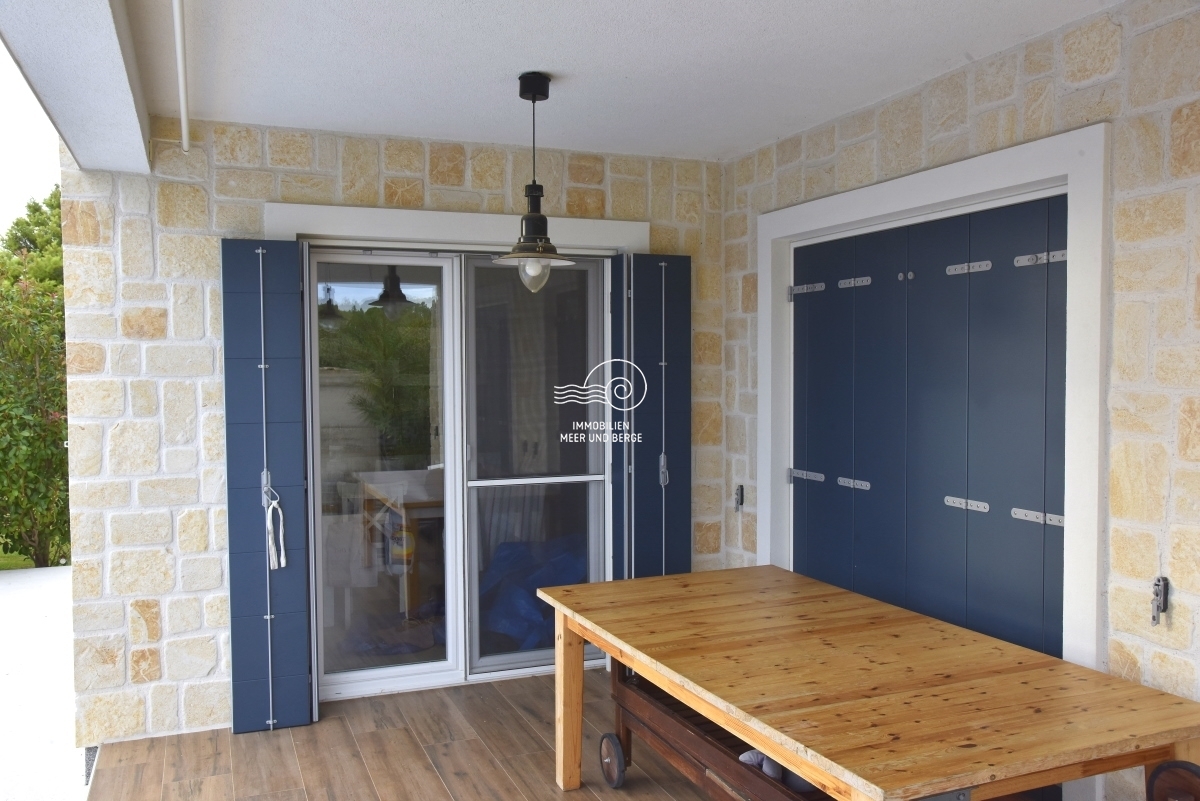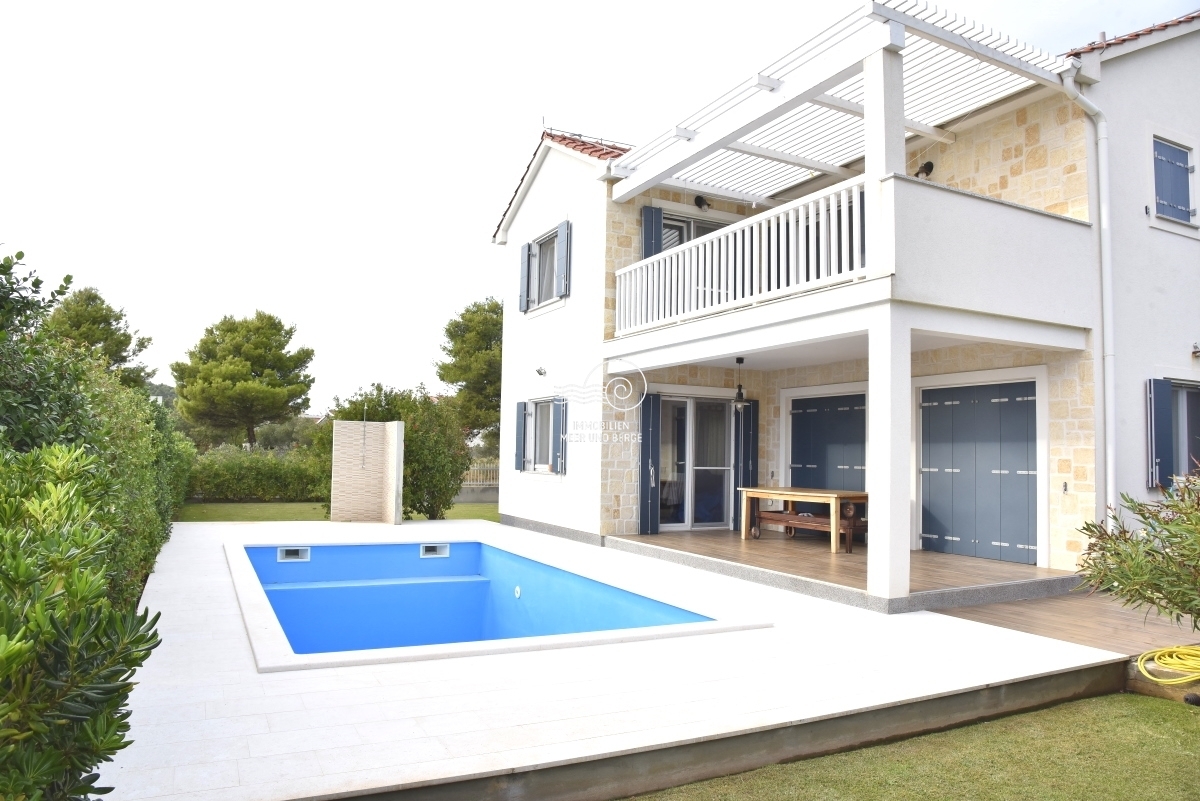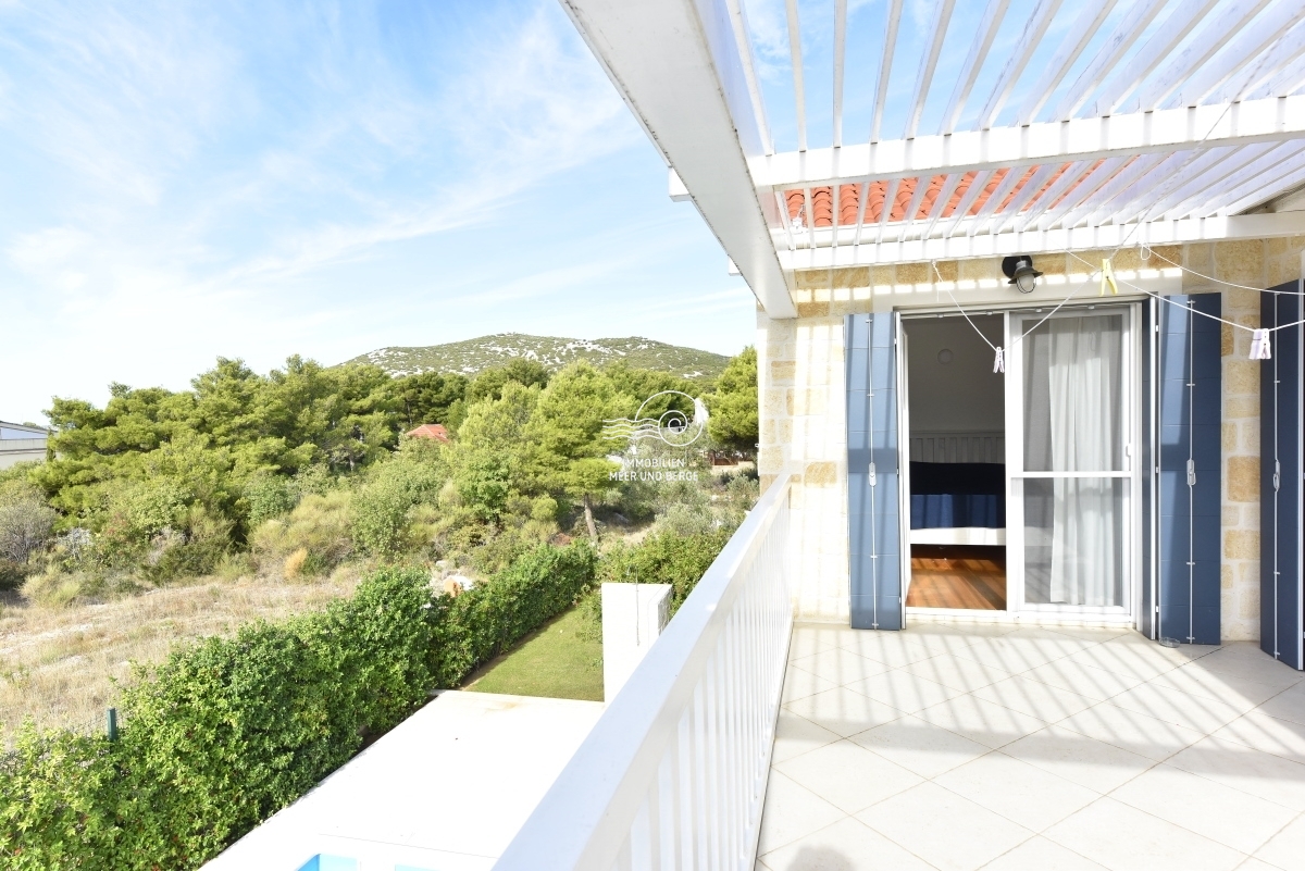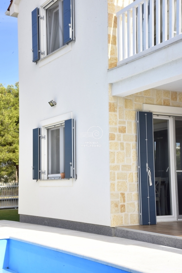 House with swimming pool for sale in Tribunj, Sovlja bay. The house consists of the ground floor: storage room, living room with kitchen and dining room, bathroom, bedroom, outdoor storage, covered terrace, pool and garden around the pool; First floor: three bedrooms with bathrooms, a storage room and an uncovered terrace. The area of the property is approx. The living area is approx. 530m2, and the living area of the house is 135m2. Each room has inverter air conditioners. The size of the pool is 7m x 4m. The heating system consists of fuel oil and radiators. There is also a solar system for the production of hot water. There is also a barbecue in the garden, and the garden has a programmable irrigation system.