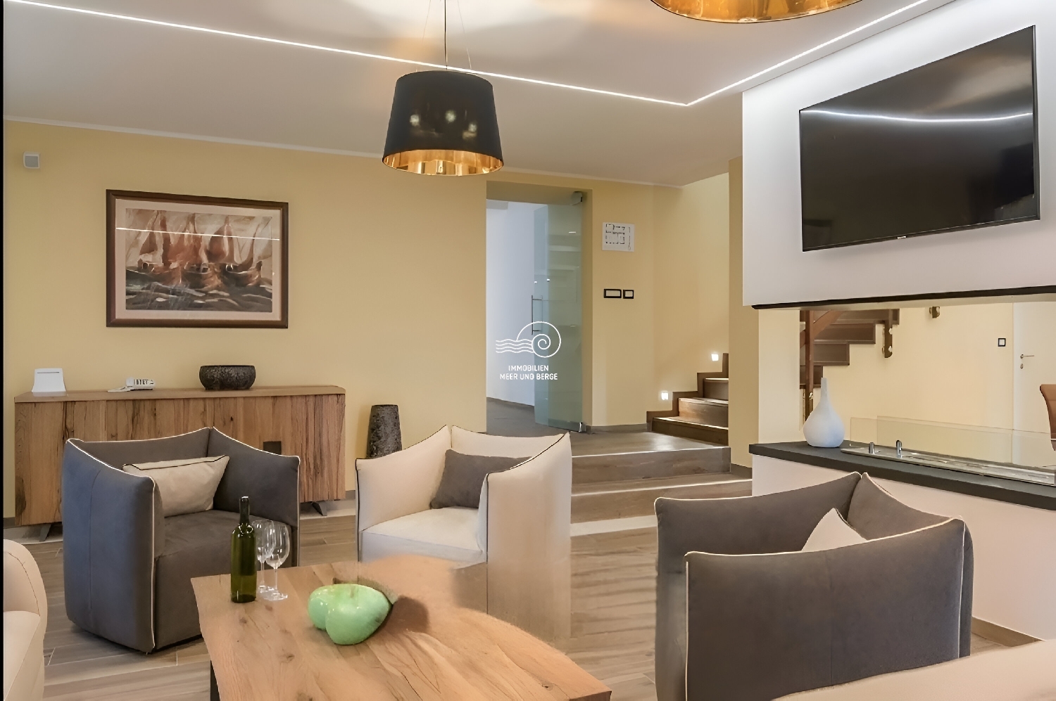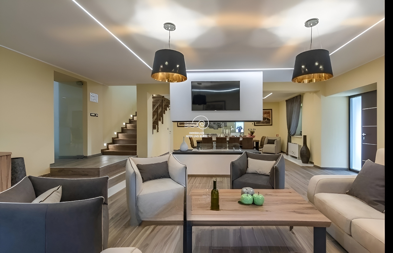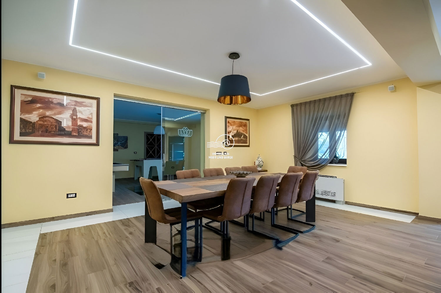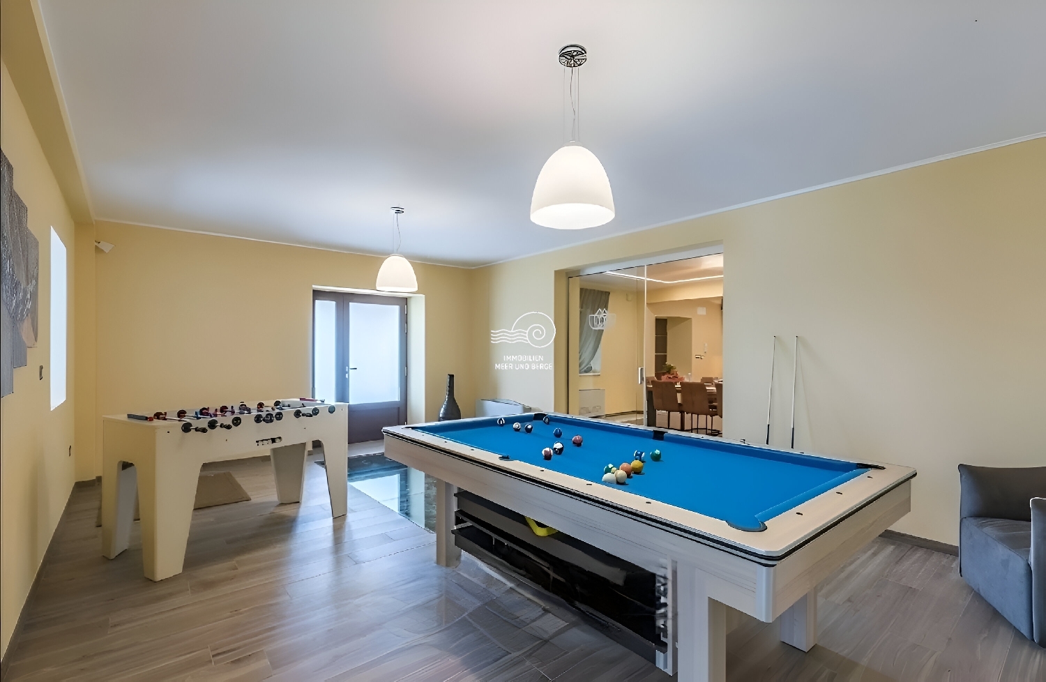 On the ground floor of this modern villa there is an indoor pool, a sauna, a room with fitness equipment, a wine cellar, an entertainment room, a modern kitchen and a spacious living room with a dining room. On the upper floor there are 4 comfortable bedrooms with 4 bathrooms. On the same floor there is a spacious terrace with a jacuzzi and a view of the olive groves and the park. Villa LV is air-conditioned, has WiFi and private parking for 8 cars. It is located near the beaches and offers everything for a relaxing vacation.