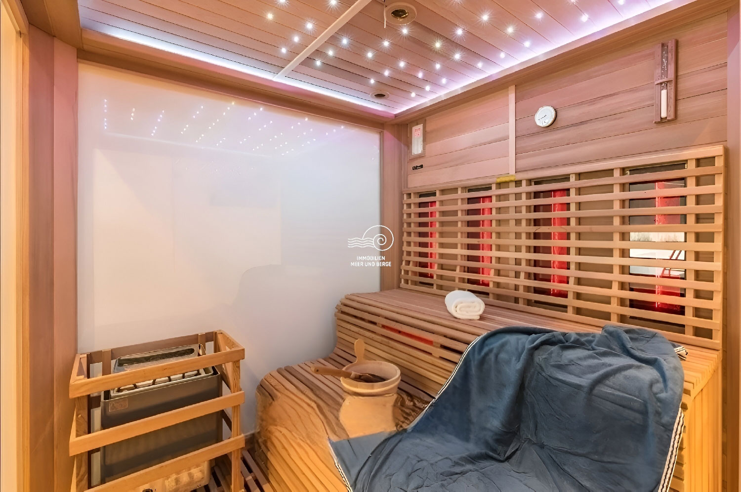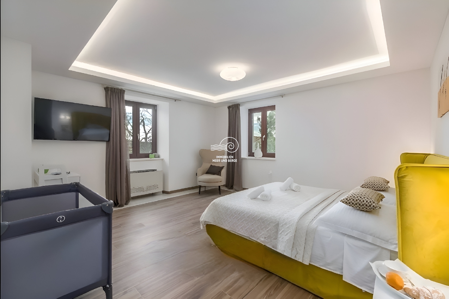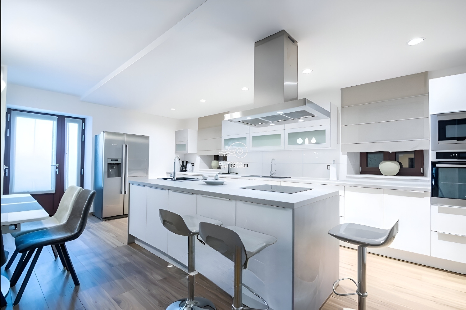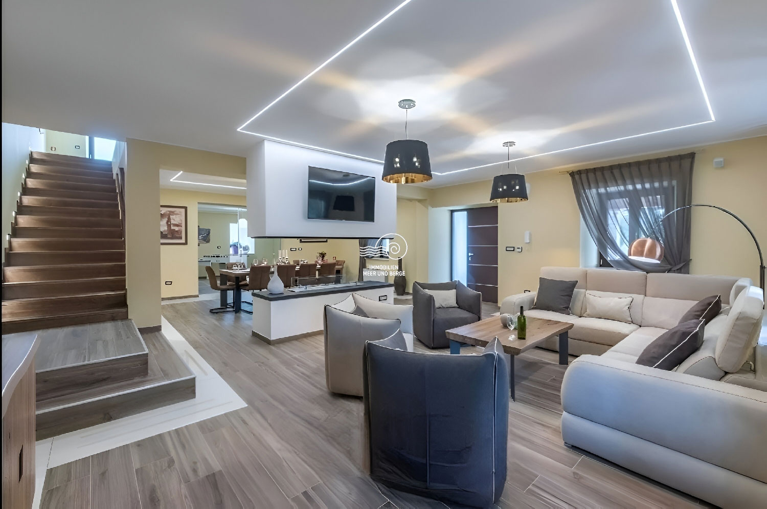 On the ground floor of this modern villa there is an indoor pool, a sauna, a room with fitness equipment, a wine cellar, an entertainment room, a modern kitchen and a spacious living room with a dining room. On the upper floor there are 4 comfortable bedrooms with 4 bathrooms. On the same floor there is a spacious terrace with a jacuzzi and a view of the olive groves and the park. Villa LV is air-conditioned, has WiFi and private parking for 8 cars. It is located near the beaches and offers everything for a relaxing vacation.