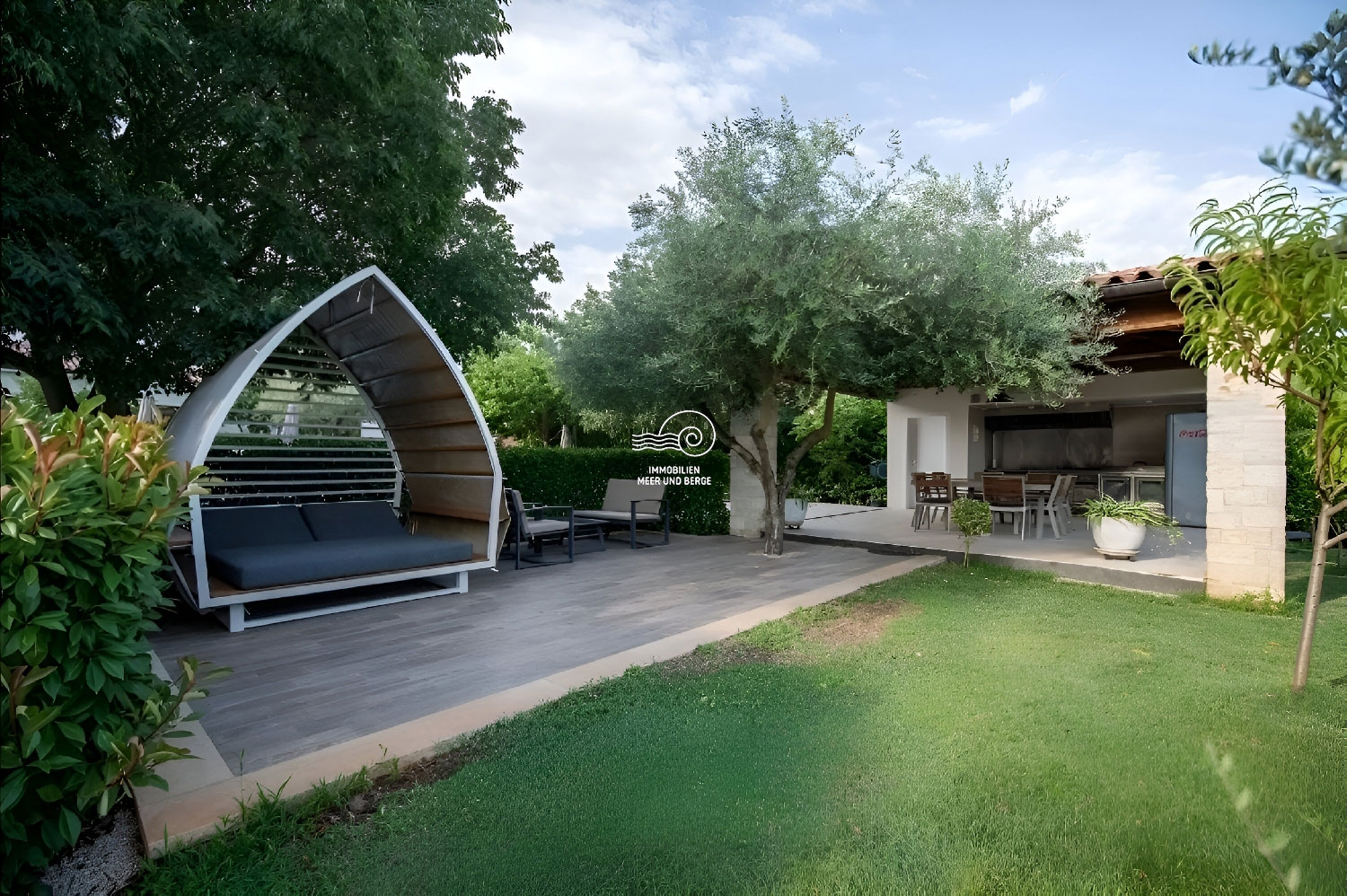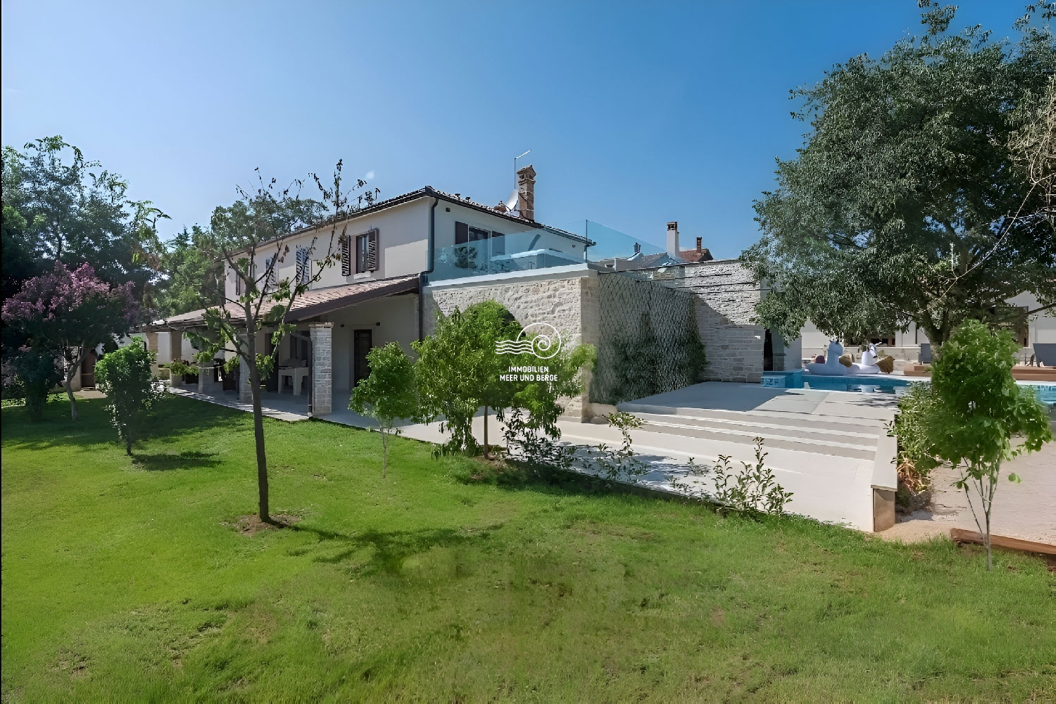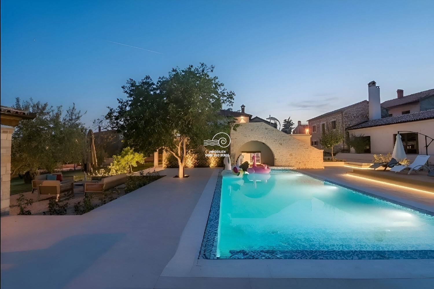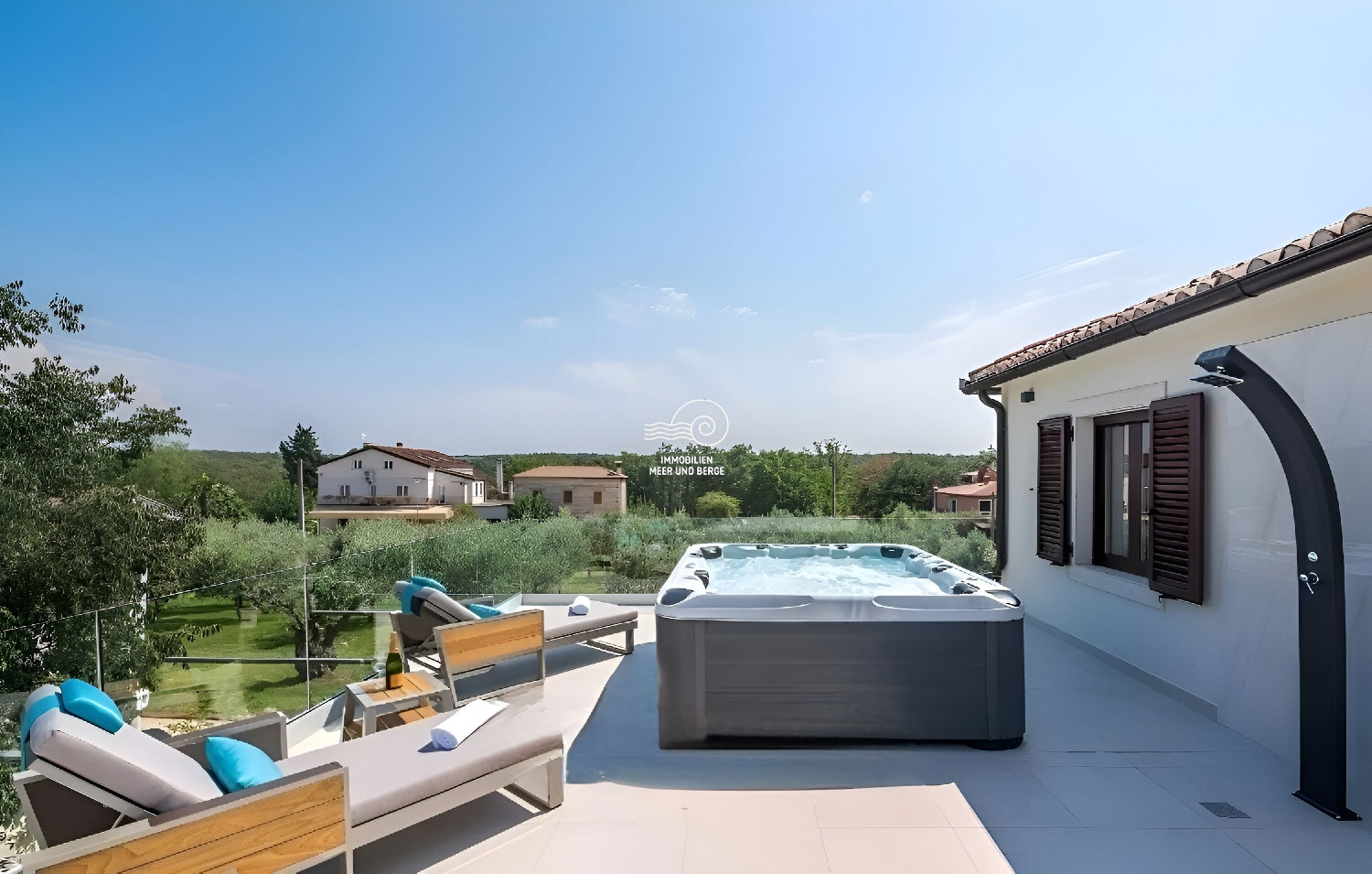 The pool covers an area of 75m2, of which 21m2 is an indoor pool. Therefore, the villa is perfect for renting all year round. The covered terrace is a relaxing place where you can enjoy the hot Istrian sun or serve a delicious dinner. The villa has a tavern with a fireplace and a dining table for 8 guests. The tavern is ideal for evening gatherings on colder days.
